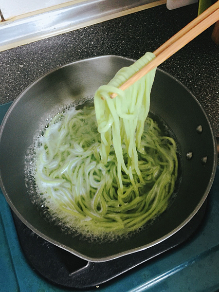 2用筷子拌開塊狀的麵條,等他熱了就可以撈起來囉