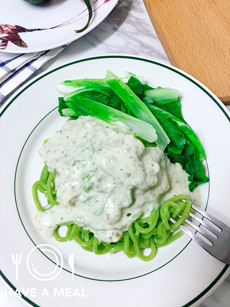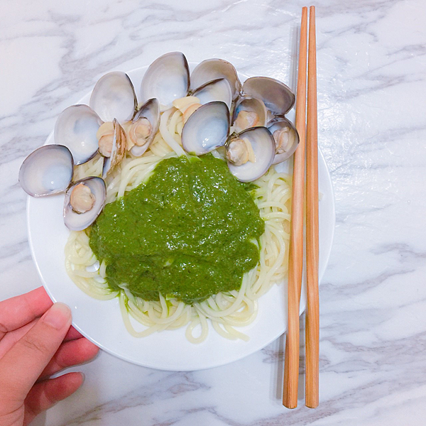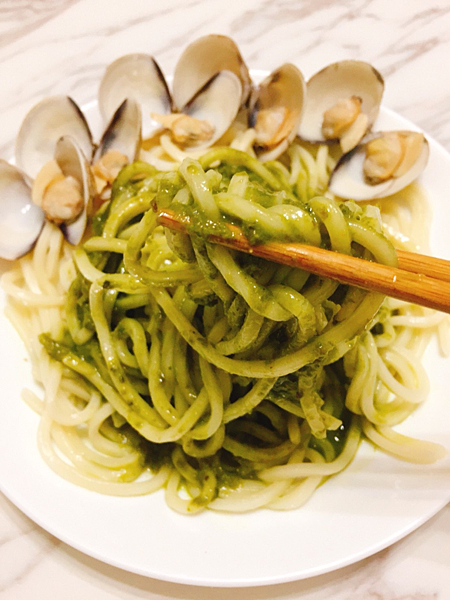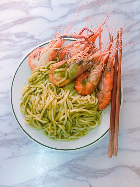 蛤蠣跟蝦子最對味堅果青醬麵跟南洋綠咖哩醬麵了