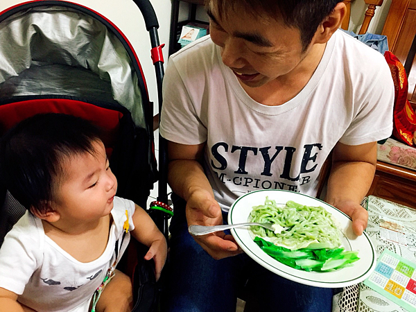 老公吃得很開心,小辰寶看著爸比好像也想吃一口唷